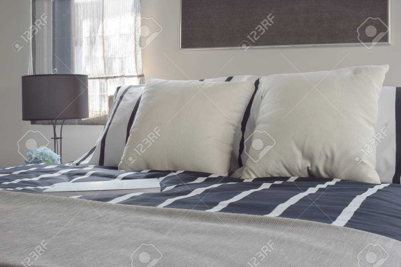 DOWNLOAD Offwhite And Striped Pillows On Bed With Deep Blue Striped Blanket Offwhite And Striped Pillows On Bed With Deep Blue Striped Blanket is Now Available